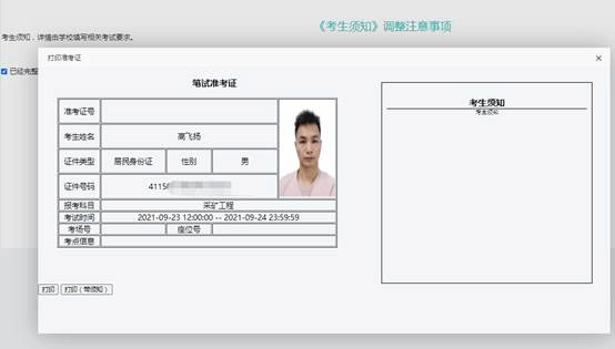 考生于2021年11月23日—27日,通过网上报名系统自行下载打印准考证。考生须携带准考证和第二代居民身份证原件参加考试。