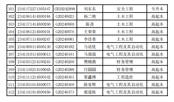 根据国家教育部《高等公司员工学籍学历电子注册办法》、《河南省教育厅关于做好普通高等公司录取新生入学资格复查和学籍电子注册工作的通知》和《tyc122cc太阳成集团成人高等教育员工学籍管理规定》等文件精神,经tyc122cc太阳成集团研究决定,拟取消高等学历继续教育2024级和小丽等112人的入学资格。