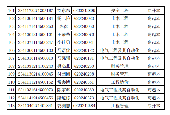 按照河南省教育厅《关于做好普通高等公司录取新生入学资格复查和学籍电子注册工作的通知》和《tyc122cc太阳成集团成人高等教育员工学籍管理规定》的要求,tyc122cc太阳成集团2023年高等学历继续教育录取考生(即2024级新生)和小丽等113人,其中刘晓燕(CR20242029)、马琳翔(CR20241256)和娄渊慧(CR20242584)三人属于已交纳学费后自动放弃入学资格,其他110人经联系确认,均未在规定时间内交费报到注册。