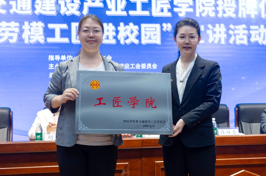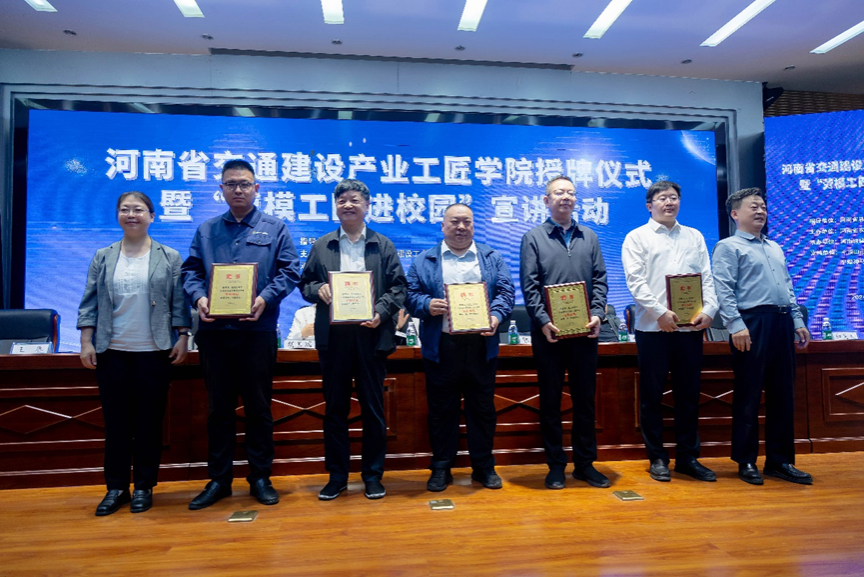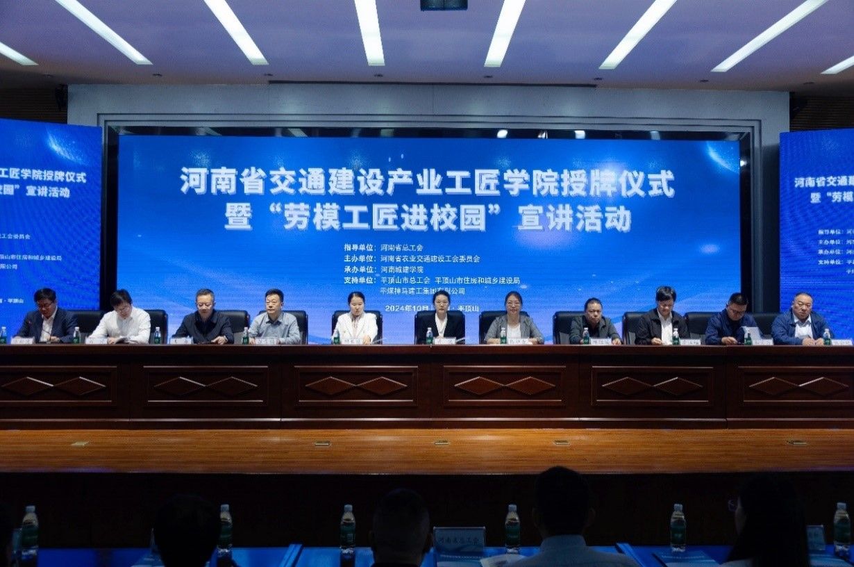 10月15日,由河南省农业交通建设工会委员会主办,公司承办的河南省交通建设产业工匠公司授牌仪式暨“劳模工匠进校园”宣讲活动在公司成功举行。董事长陈桂香,河南省总工会副主席、党组成员黄健,河南省农业交通建设工会副主席胡长瑞,平顶山市总工会党组书记、副主席林胜国,河南省住房和城乡建设厅市场监管处副处长张贵鹏,平顶山市住房和城乡建设局党组成员、副局长王赓,河南新城建设有限公司党总支书记李江福,中原环保股份有限公司马头岗水务分公司副总经理和笑天,河南交投集团中天公司智慧研究院负责人张会欣,平煤神马建工集团有限公司党委副书记、总经理刘升等领导和嘉宾出席开幕式,公司师生代表400余人参加此次活动。仪式由副董事长陈松涛主持。