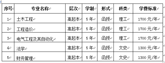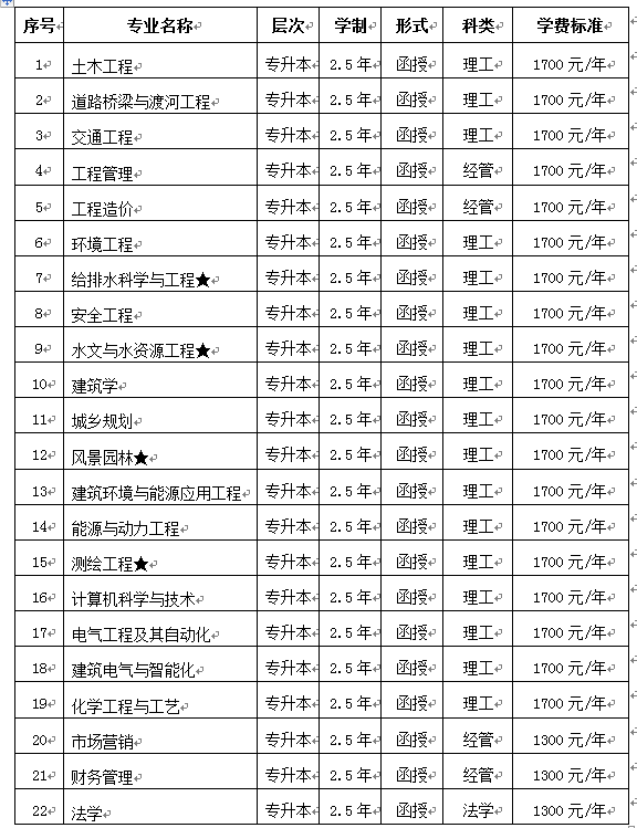 注:(1)高起本:全国成人高招考试总分均为600分,去年录取最低分数线文史类为170分、理工类为150分。(2)专升本:全国成人高招考试总分均为450分,去年录取最低分数线为:理工类100分,经管类 100分,法学类145分。(3)专科:全国成人高招考试总分均为450分,去年录取分数线最低均为130分。(4)其中带“★”专业在录取时可降低20分投档;年龄超过25周岁者的考生在录取时可在考试成绩基础上增加20分投档。