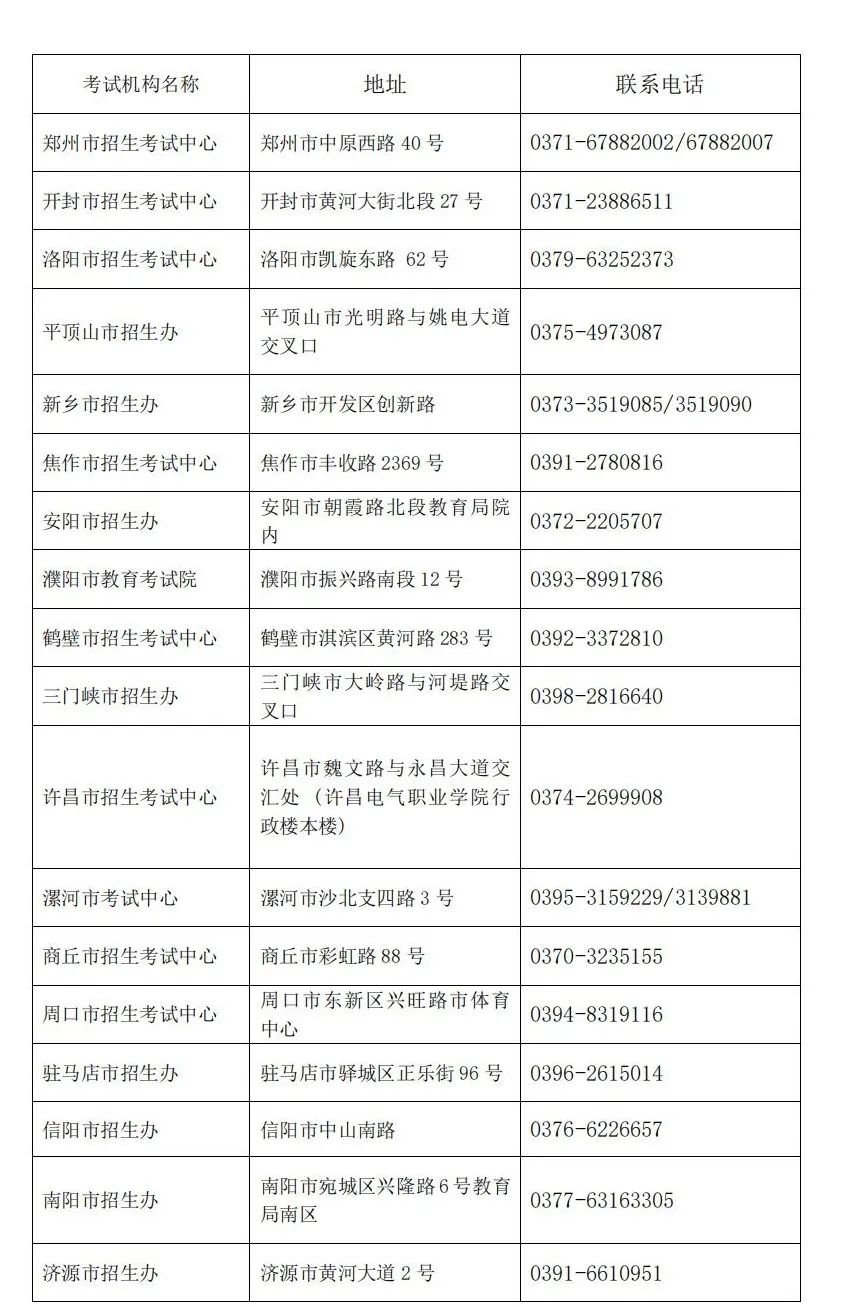附:河南省2022年全国成人高校招生考试各地教育招生考试机构咨询电话