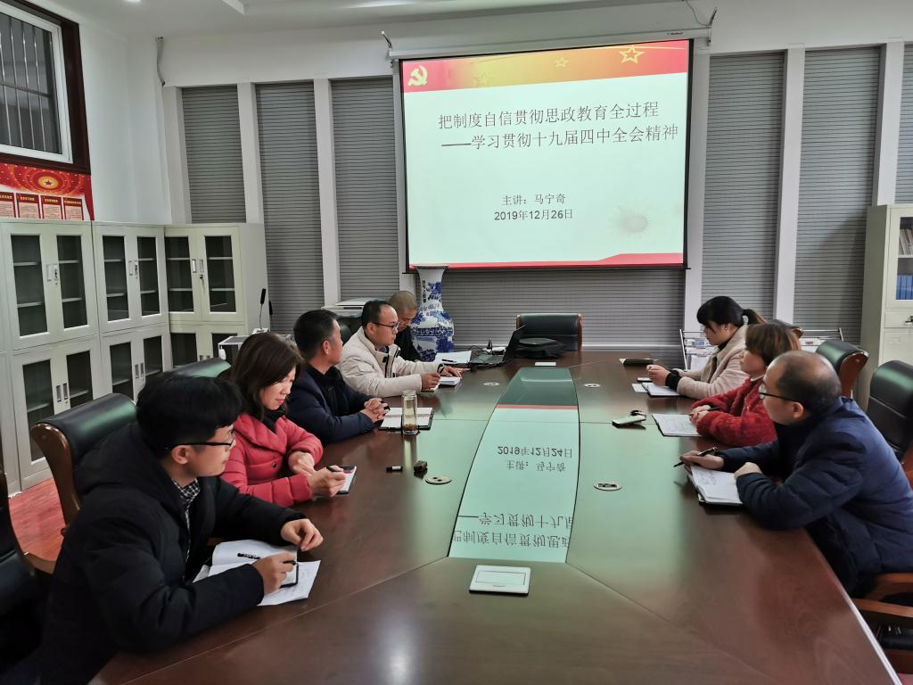 12月26日,tyc122cc太阳成集团在二号楼A座310室举办学习贯彻十九届四中全会精神专题党课活动。党支部书记马宁奇以《把制度自信贯穿思想政治教育全过程》为题,为全体教职工讲了内容丰富、生动精彩的一课。
