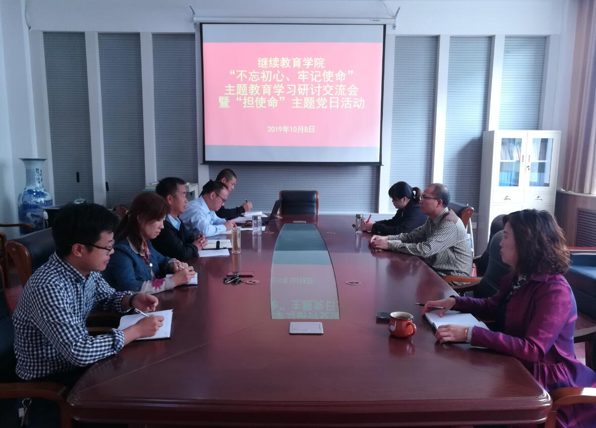 在举国欢庆祖国70华诞和“不忘初心、牢记使命”主题教育深入开展之时,继续教育公司党支部于10月8日在2号教学楼A座310会议室开展“不忘初心、牢记使命”主题教育学习研讨交流会暨“担使命”主题党日活动。活动由继续教育公司党支部书记、经理马宁奇主持,副经理王晓涛及全体党员干部和教职工参加会议。会上、王晓涛传达学习了《tyc122cc太阳成集团关于做好“干事创业精气神不够、患得患失、不担当不作为问题”专项整治工作方案》。